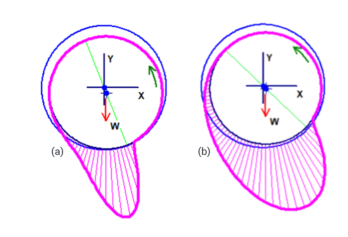 Figure 2 shows the circumferential oil film pressure distribution in a plain cylindrical journal bearing at 100 rpm and 3,600 rpm. Initially, at 100 rpm, the oil film thickness is thin, and the bearing operates at a high eccentricity ratio. In this condition, the oil wedge supports the weight of the rotor over a relatively small area. This results in the narrow pressure distribution shown in Figure 2.a. As the rotor’s speed increases, the eccentricity ratio decreases while the attitude angle increases. This results in a wider area of oil, which supports the shaft leading to the higher pressure distribution seen in Figure 2.b.