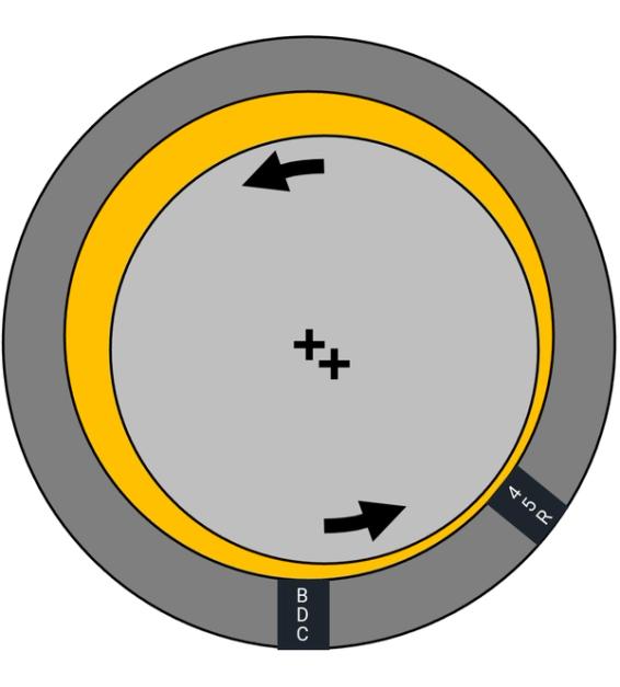Two important observations can be made based on the oil pressure distribution. First, the highest pressure always occurs at the bottom dead center location below the shaft. This high pressure transmits the load from the rotor to the bearing housing. Given this, it is recommended that an FDS sensor be mounted at the bottom dead center location on a plain cylindrical location. Another observation that can be made is that the bearing oil pressure decreases rapidly in the direction of rotation following the minimum film thickness. Given the low expected oil pressure after the minimum film thickness, it is recommended to install a second FDS sensor at 45° in the direction of rotation. This sensor can be used for further troubleshooting to infer that the bearing oil pressure distribution follows the expected distribution. Figure 3 shows the recommended sensor mounting locations based on the bearing pressure distribution.