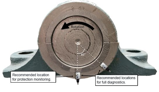 In the last video, the recommended installation locations on three different styles of fluid film bearings were discussed. On a plain cylindrical journal bearing, two locations were recommended. One sensor should be installed at the bottom dead center of the bearing, while a second sensor can be installed 45° in the direction of rotation for added diagnostic capabilities. Figure 3 shows these two sensors, which were installed at the proper locations with the proper orientations on the bearing.