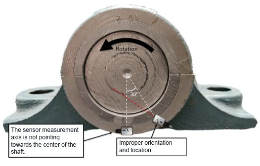 Figure 4 shows an example of these two sensors installed improperly on the same bearing. In the figure, it can be seen that the measurement axis of the bottom dead center sensor is not pointing towards the center of the shaft. Additionally, the second sensor is installed at only 30° with rotation from the bottom dead center location, and its measurement axis is not pointing towards the center of the shaft. The improper sensor orientation and position of the sensors will cause inaccurate data to be collected.