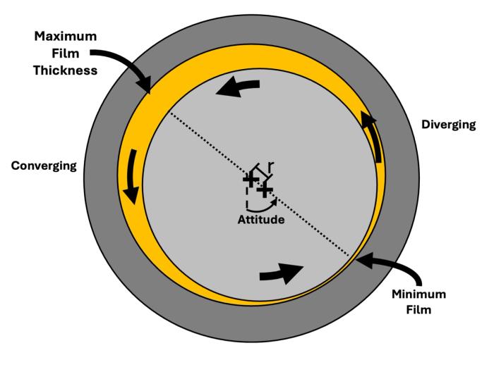 Figure 1 shows the plain cylindrical bearing, which is the simplest design of a fixed geometry fluid film bearing. As a review, cross-coupling of a fixed geometry bearing causes displacement of the shaft in the direction of the supporting load from the oil wedge and displacement perpendicular to the direction of the supporting load in the direction of rotation. Cross-coupling leads to the attitude angle of the rotor during operation. The operating position of the bearing, as shown in the figure, causes a region of high pressure which grows in width as the shaft speed is increased. The oil pressure distribution in a plain cylindrical journal bearing can be seen in Figure 2.